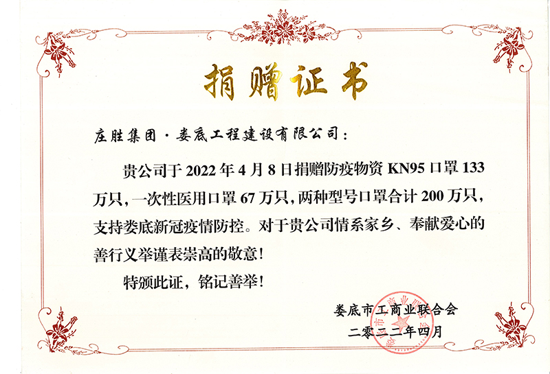 2022年為支持婁底新冠疫情防控捐贈中N95口罩133萬只,一次性醫(yī)用口罩67萬只捐贈證書