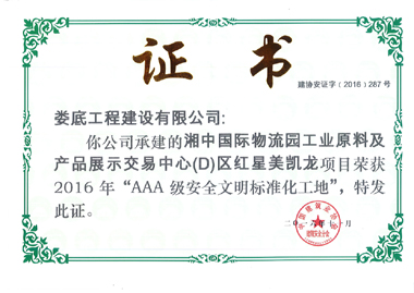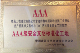 2016年11月23日,在安徽合肥舉行的中國建筑業(yè)協(xié)會安全分會2016年年會暨理事會上,我公司承建的湘中國際物流園工業(yè)原料及產(chǎn)品展示交易中心(D)區(qū)紅星美凱龍工程被評為AAA級安全文明標準化工地。這是我司繼2011年11月金谷建設小區(qū)8#、9#棟工程榮獲AAA級安全文明標準化工地后,又一次獲此殊榮。